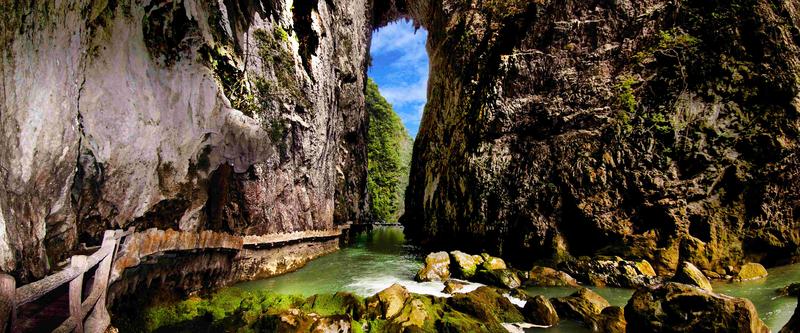 鴛鴦湖是小七孔一奇景,湖水如油,碧綠而凝重。因湖中有兩棵并排參天的大樹而得名,這兩棵大樹半截在水中,枝葉則在上方交握,雌樹纖巧,雄樹則兩三人才能環(huán)抱過(guò)來(lái),雄壯挺拔。湖面幽靜,水道四通八達(dá)。