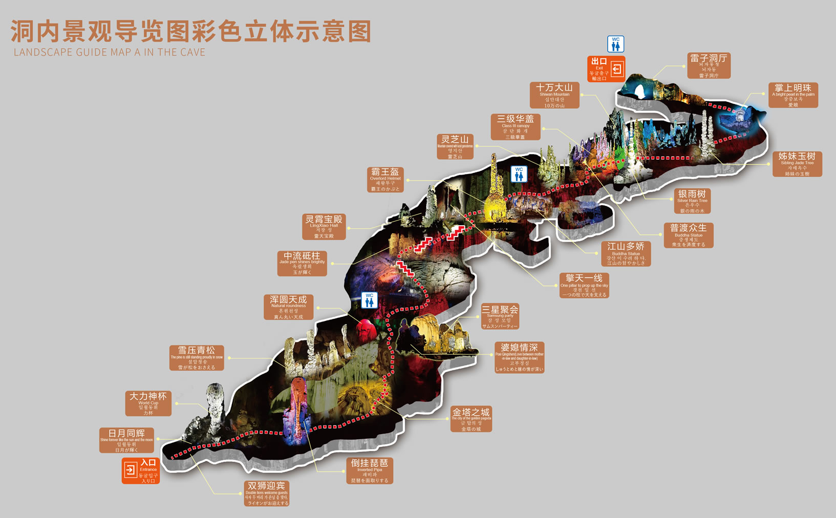 遠古時洞頂塌落的巨石堆積如山,稱“萬壽山”。后來山上又覆滿巖溶堆積物。上有珍奇的“穴罐”,呈橢圓形。旁有“雞血石”,晶瑩緋紅,酷似“孔雀開屏”。有三尊“壽星”,高十至二十米。洞頂和廳壁由黃、白、紅、藍、褐諸色構(gòu)成美麗的圖案。
