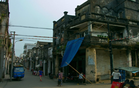 據(jù)史書記載,定安古城從籌建到1519年竣工共費(fèi)時13年。城圍長近千米,高四米多,寬五米多,開有東、南、西城門,各建有城樓。北門是1545年才開的,后來因不堪倭寇的騷擾,曾經(jīng)堵上過,直到1690年才又重開。古城的城墻在建國初期就已經(jīng)被拆毀了,城門這一塊大概是因?yàn)榭此Y(jié)實(shí)牢固,便利用來建了樓房,因此還被保存下來。城門洞里放著兩只卸了龍頭的龍舟,已經(jīng)很舊,架在木樁子上。地是用青石板鋪設(shè)的,經(jīng)過幾百年人來人往,石板被磨得很薄。門洞里的墻面上也是一塊塊青石磚砌的,摸上去很干爽,一點(diǎn)也沒有陳年的霉味。