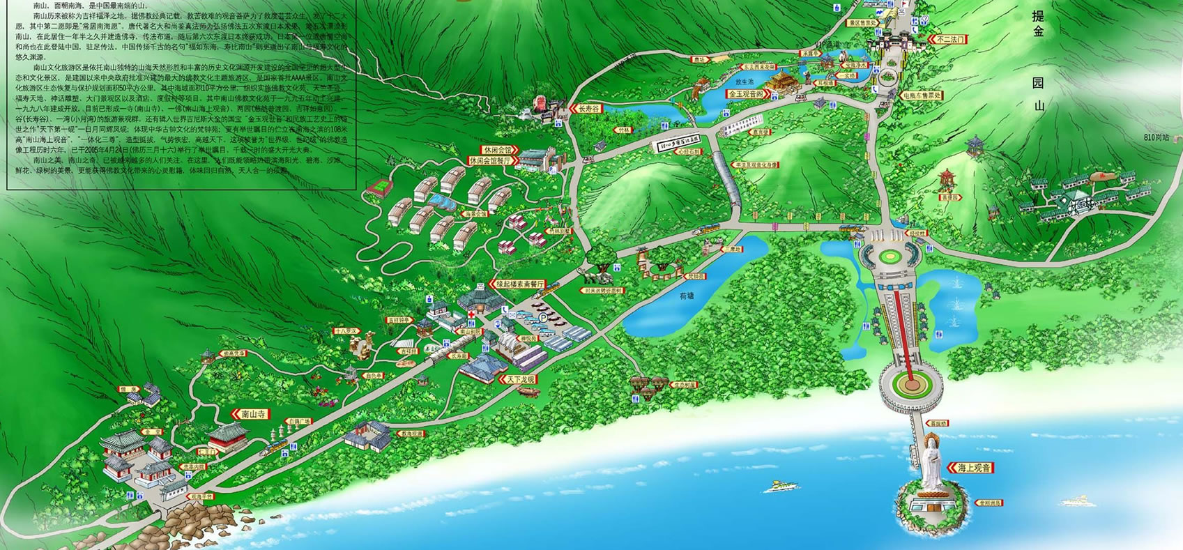 三亞南山風(fēng)景區(qū)是國(guó)家旅游局確定的“中國(guó)旅游業(yè)發(fā)展優(yōu)先項(xiàng)目”。它位于中國(guó)唯一的熱帶濱海城市三亞市的西部,是全國(guó)罕見的超大型文化和生態(tài)旅游園區(qū)。園區(qū)規(guī)劃面積五十平方公里,其中海域面積十多平方公里,由美國(guó)紐約國(guó)際城市設(shè)計(jì)公司統(tǒng)籌規(guī)劃,美國(guó)經(jīng)濟(jì)咨詢聯(lián)合公司提供可行性報(bào)告。項(xiàng)目?jī)?nèi)容策劃分別由中國(guó)佛教文化研究所、中國(guó)民俗學(xué)會(huì)、中國(guó)歷史博物館、中央民族大學(xué)、中國(guó)環(huán)境科學(xué)院、中國(guó)科學(xué)院生態(tài)中心完成。該項(xiàng)目是海南省的重點(diǎn)建設(shè)項(xiàng)目,同時(shí)被三亞南山風(fēng)景區(qū)是國(guó)家旅游局確定的“中國(guó)旅游業(yè)發(fā)展優(yōu)先項(xiàng)目”。它位于中國(guó)唯一的熱帶濱海城市三亞市的西部,是全國(guó)罕見的超大型文化和生態(tài)旅游園區(qū)。園區(qū)規(guī)劃面積五十平方公里,其中海域面積十多平方公里,由美國(guó)紐約國(guó)際城市設(shè)計(jì)公司統(tǒng)籌規(guī)劃,美國(guó)經(jīng)濟(jì)咨詢聯(lián)合公司提供可行性報(bào)告。項(xiàng)目?jī)?nèi)容策劃分別由中國(guó)佛教文化研究所、中國(guó)民俗學(xué)會(huì)、中國(guó)歷史博物館、中央民族大學(xué)、中國(guó)環(huán)境科學(xué)院、中國(guó)科學(xué)院生態(tài)中心完成。該項(xiàng)目是海南省的重點(diǎn)建設(shè)項(xiàng)目,同時(shí)被海南省授予“海南省生態(tài)建設(shè)示范工程”、“海南省生態(tài)旅游示范景區(qū)”,并得到了中央有關(guān)部門、佛教界、文化界的高度重視。它的建成填補(bǔ)了海南歷史文化旅游的空白,進(jìn)一步突出海南大生態(tài)旅游優(yōu)勢(shì),為中國(guó)旅游添光增彩。