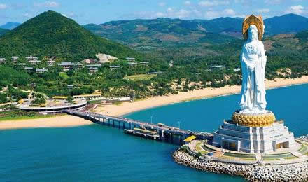 三亞南山海上觀音圣像敬造工程因其規(guī)模宏偉、意義殊勝、佛理底蘊(yùn)豐富,被譽(yù)為“世界級(jí)、世紀(jì)級(jí)”的佛事工程。像體為正觀音的一體化三尊造型,寶相莊嚴(yán),腳踏一百零八瓣蓮花寶座,蓮花座下為金剛臺(tái),金剛臺(tái)內(nèi)是面積達(dá)15000平方米的圓通寶殿。金剛洲由長(zhǎng)280米的普濟(jì)橋與陸岸相連,并與面積達(dá)60000平方米的觀音廣場(chǎng)及廣場(chǎng)兩側(cè)主題公園,共同組成占地面積近30萬(wàn)平方米的“觀音凈苑”景區(qū)。