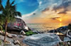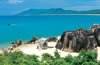 天涯海角位于天涯區(qū)的馬嶺山腳下,距三亞市區(qū)約26千米。其前海后山,風(fēng)景獨特。步入游覽區(qū),沙灘上那一對拔地而起的高10多米,長60多米的青灰色巨石赫然入目。兩石分別刻有“天涯”和“海角”字樣,意為天之邊緣,海之盡頭。“天涯海角”就是由此得名的。