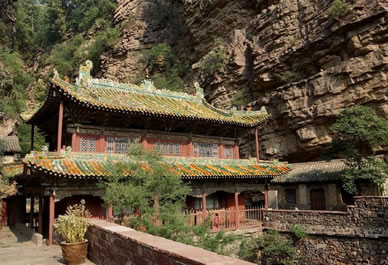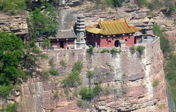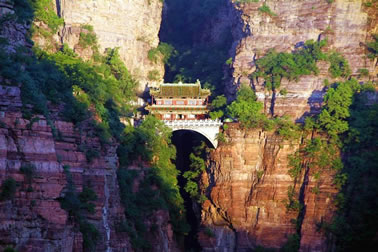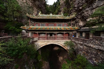 一絕“橋樓殿”。橋凌駕于百仞峭壁之間,仰視藍(lán)天一線,俯首萬(wàn)丈深淵。形制如同趙州橋敞肩拱式。橋上建樓,云飛樓動(dòng),樓內(nèi)建殿,殿內(nèi)三尊大佛。真是“千丈虹橋望入微,天光云彩共樓飛”,不是仙境勝似仙境,疑是天堂落塵!,F(xiàn)為中國(guó)三大懸空寺之一。