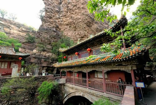 在這些峰巒之間,散落著眾多禪房、古剎、亭臺(tái)、碑碣,大都是明清時(shí)期的遺物,這些建筑或建于峭壁之上,或坐落于斷崖之下,雕梁畫(huà)棟,古色古香。主要的有福慶寺、書(shū)院、萬(wàn)仙堂、公主祠、橋樓殿、玉皇頂、峰回軒、藏經(jīng)樓等。