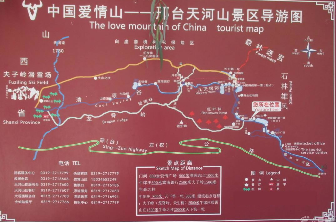天河山停車(chē)場(chǎng)→天河湖大壩→漢闕大門(mén)→愛(ài)情廣場(chǎng)→摩訶池→蝶仙谷→山神廟→凌波湖→凌雪湖→九天銀河→天門(mén)→珍珠泉→串珠壺穴→(十八盤(pán))→香溪潭→紅河谷→一線天→情人谷→滴水崖→綠色長(zhǎng)廊→冀南銀行舊址→姐妹柳→云頂草原→原始次生林→龍脊嶺→下山