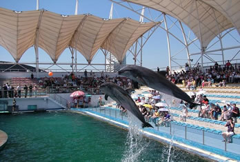 海豚表演館于2000年5月1日正式營業(yè),投資近6000萬元人民幣,占地面積約3000平方米。三面環(huán)座的看臺可同時容納2000名游客,站在看臺極目遠眺,表演池和大海仿佛融為一體。在優(yōu)美音樂的伴隨下,不僅可以欣賞到海豚的水中華爾茲、空中頂球、跳圈、跨桿、環(huán)場鞠躬跳等高難度的精彩表演;還可以領略海獅投籃、水中霹靂舞、中國功夫等出色的演技;同時您還有機會親身觸摸海豚,與它握手交流,共同感受人與自然默契相通的美好境界。