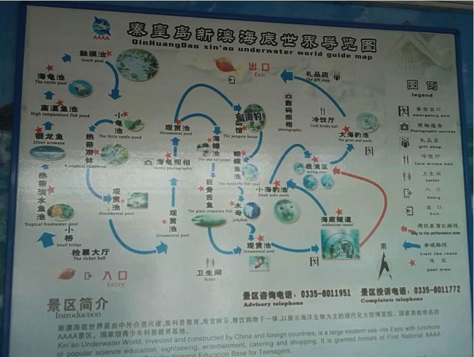 秦皇島新澳海底世界總建筑面積約2萬平方米,總儲水量約650萬千克。景區(qū)主要由水族館和海豚表演館兩部分組成,其中,水族館主要包括小池區(qū)、企鵝館、海豹館、觸摸池、海底隧道、表演區(qū)、科普展廳、科普教室以及海洋精品店等部分組成。
