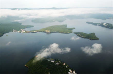 湖州城,又名城墻砬子,位于百里長湖中南部。是景區(qū)一級人文景源(國家級)。該景觀是由三個大的梯次排列的山峰組成,最高峰海拔524米,三面臨湖,實(shí)是個大半島。此景觀山脊蜿蜒,回繞如屏,石砬聳立,怪石嶙峋,奇峰薈萃,千巖爭芳,峭壁天險(xiǎn),易守難攻。698年—926年1300多年前,渤海國時期為防契丹族入侵在此山上筑有一座古城。