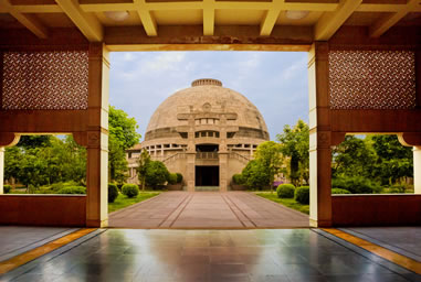 印度佛殿規(guī)劃占地6000平方米,建筑面積為3450平方米。主要建筑包括大佛殿、回廊、牌樓等,布局規(guī)整,別具匠心。大佛殿仿印度著名佛教遺址桑奇大塔建造。大佛殿中央供奉佛祖說法像,表現(xiàn)佛陀在鹿野苑第一次說法——說四圣諦度五比丘的情景。頂部安裝有玻璃天窗,陽光從天窗投射下去,照射在佛像周圍。大佛殿上下兩層塔身及殿門前牌坊上雕刻有佛本行故事與佛本生故事。大佛殿底部設(shè)計(jì)有水系。