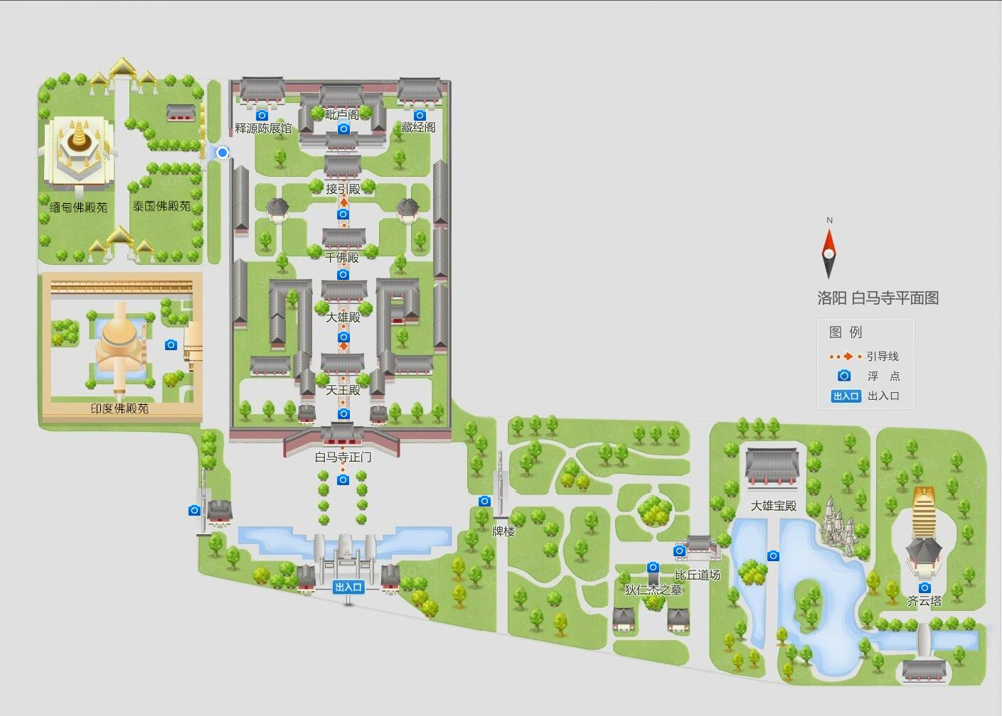 佛殿位于由南到北的中軸線上,從前到后依次分布著山門、天王殿、大佛殿、大雄殿、接引殿、清涼臺(tái)和毗盧閣等主要建筑。其中,天王殿為高臺(tái)歇山式建筑,初建于元代,明代重建,東西面闊5間,南北進(jìn)深3間,殿內(nèi)正中安置著從故宮運(yùn)來的雕龍貼金佛龕,內(nèi)供明代“夾纻”大肚彌勒像像、四大天王像、韋馱天將像等;大佛殿始建于元代,明代重建,后又多次修葺,高臺(tái)歇山式建筑,雙下昂六鋪?zhàn)鞫饭。東西面闊5間,南北進(jìn)深3間,是寺院佛事活動(dòng)場(chǎng)所,也是僧人早晚課誦的地方。內(nèi)供釋迦佛、文殊、普賢二菩薩,迦葉、阿難二弟子、供養(yǎng)天人、觀世音菩薩等塑像。懸掛于大佛殿內(nèi)東南角的大鐘鑄于明代嘉靖三十四年(1555年),通高1.65米,重二千五百斤;大雄殿始建于唐宋,元代重建,明代改建,為高臺(tái)懸山式建筑,東西面闊5間,南北進(jìn)深3間,內(nèi)供釋迦、阿彌陀、藥師“三世佛”,韋馱、韋力二天將,十八羅漢等23尊元代夾纻造像,韋力天將泥塑像等;接引殿原為明代建筑,清同治年間(1862—1874年)毀于大火。光緒年間(1875—1908年)重建,硬山式,面闊3間,進(jìn)深2間,內(nèi)供阿彌陀佛及觀世音、大勢(shì)至二菩薩像;清涼臺(tái)在白馬寺的最后部,是一座磚砌的高臺(tái),東西長(zhǎng)42.80米,南北寬32.40米,高約6米,雄渾古樸,蔚為壯觀;毗盧閣,高聳豎立于清涼臺(tái)上,是白馬寺最后一座大殿,面闊5間,進(jìn)深4間,長(zhǎng)17.03米,寬11.7米,高約15.5米,殿頂為重檐歇山式,內(nèi)供毗盧佛、文殊、普賢二菩薩。