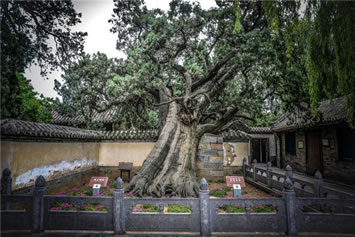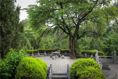 二程手植槐,樹高19.5米,圍粗4米。雖然樹干嶙峋,中空外實,槐冠卻叢撥陰濃,新枝簇簇,樹姿優(yōu)美,老而不衰。相傳為北宋理學名家程顥到嵩陽書院講學時親手所栽。
