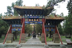 峻極殿前筑有3米高的月臺,周圍有石雕欄桿,月臺正面有三道石階。中間的臺階分二路,二路間鑲有垂帶式“御路”一石,上面浮雕著精美的圖案,上截為“獨(dú)龍盤踞”,中間為“雙龍戲珠”,下邊為“群鶴鬧蓮”等紋飾。月臺下面為拜臺,左右為兩座秀麗的御碑亭,兩亭均為重檐八角,東為“御捍亭”,內(nèi)立清乾隆十五年(1750年)的御碑,西為“御帛亭”,內(nèi)立清乾隆四十八年(1783年)的御碑,其字乃草書。