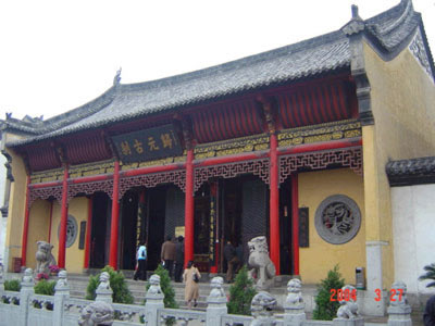 中院的主體建筑是大雄寶殿。該殿初建于清順治十八年(1661年),后經(jīng)多次維修,F(xiàn)大雄寶殿是清光緒三十四年(1908年)重修,經(jīng)過近年來的維修,氣勢宏偉。大殿正中供奉著釋迦牟尼坐像,兩側為其弟子阿難和迦葉,均為托沙雕塑。釋迦“偏袒右肩,結跏趺坐”,十分莊嚴靜穆,威儀儼然。佛像后的背光是用樟木雕刻而成的“五龍捧圣”的圖案。佛像前還有韋馱、彌勒、地藏像,佛像后是一組海島觀音像,只見海島觀音赤足站在鰲頭上,左右侍立著龍女和童子,背后是一面高達八尺的泥塑懸崖峭壁,足下碧波萬頃,怒濤洶涌。整個塑像向前傾覆。人們仰視上去,只見觀音衣袖似在飄動,正在洶涌的波濤上迎面向你浮來,增加了宗教藝術的感染力。