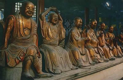 中國漢地佛教尊崇五百羅漢是從五代時開始的。當時,吳越王錢氏在天臺山方廣寺造五百銅羅漢。顯德元年(954年),道潛禪師得吳越錢忠懿王的允許,在杭州凈慈寺創(chuàng)建了五百羅漢堂。宋太宗雍熙二年(985年),造羅漢像五百一十六身(十六羅漢與五百羅漢),奉安于天臺山壽昌寺,從此各地大寺院多建五百羅漢堂。關于五百羅漢的名號,五代時(復齋碑錄》有關于天臺山石橋寺五百羅漢的名號,今已不存。另有南宋紹光四年(1134年)工部郎高道素所錄江陰軍(乾明院五百羅漢尊號碑》,將五百羅漢一一起名造姓。佛教研究者認為,碑中所舉五百羅漢的名號毫無典據(jù),是宋人附會之談而已。但此后,凡寺院建五百羅漢堂,皆援用其名。