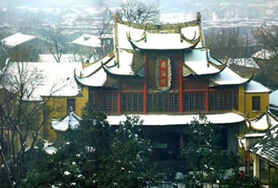 北院的主體建筑是藏經(jīng)樓。藏經(jīng)閣1920年至1922年興建,是一座兩層五開問的樓閣式建筑,高約25米,頂為獸頭大脊,魚角搬爪,斗拱飛檐,古樸玲瓏,當面為四柱通天,雙鳳朝陽,五龍戲珠。整個建筑、門扇窗牖,涂朱繪彩,刻畫鏤雕,精巧壯觀,金碧輝煌,是武漢市唯一一座磚木結構的古建筑物。這里珍藏著許多佛教文物,除《藏經(jīng)》外,還有佛象、法物、石雕、木刻、書畫碑帖及外文典籍等。