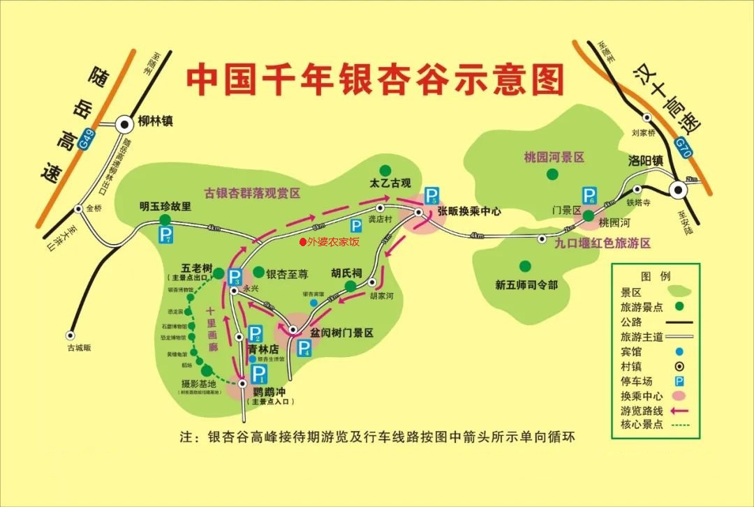 2、隨州:從隨州市區(qū)出發(fā),沿迎賓大道(在隨州職業(yè)技術(shù)學(xué)院、白云山國賓酒店斜對面約2公里)左轉(zhuǎn),過 浪河村抵達洛陽鎮(zhèn)千年銀杏谷景區(qū),全程31公里。