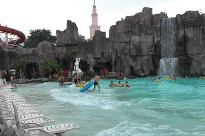 梯。輕舟蕩漾的環(huán)流河,洶涌澎湃的人造海浪,卡通境界的兒童池以及深水池、按摩池,是老少皆宜的歡樂海灣。