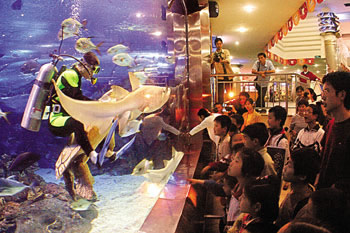 為使都市人品味玩魚樂趣,海底世界專設玩魚、購魚一條街,令人休閑渡假時陶醉無窮的魚趣之中。 總之,整個園內建設充分體現(xiàn)出現(xiàn)代化、高品位的海洋文化氛圍,是游人開闊眼界、休閑渡假的文化勝地。