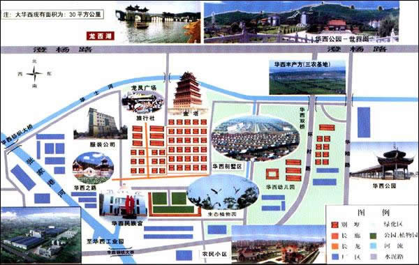 村頭粉墻照壁,后為廣場。廣場上數(shù)十旗桿,飄揚著各種圖案的彩旗,這是華西實業(yè)公司所屬工業(yè)的標(biāo)志,顯示出它的經(jīng)濟實力,產(chǎn)值數(shù)十億,產(chǎn)品遠銷國外。