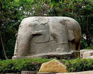 從龍洞西行,在林木掩映的山坡上.屹立著一座碩大的漢代圓雕石象。石象依一塊花崗巖巨石的自然形狀雕刻而成雕刻而成,象身高2.6米,長(zhǎng)4.8米,背寬3.5米,石像耳闊體肥,四肢健壯,長(zhǎng)鼻巨牙、卷尾粗足,形態(tài)雄奇,豐滿(mǎn)肥碩。象身西側(cè)有一高0.88米,寬0.49米,深0.2厘米的陰鑿凹面,系未見(jiàn)刻銘的題榜,象身東側(cè)以陰線刻一高1.13米,寬0.62米的方框,內(nèi)刻隸書(shū)“象石”字樣,在刻銘與象前腿之間,還鑿刻了一個(gè)頭梳“丁”字形發(fā)髻,手持勾鞭,腳帶鐐銬高0.92米的馴象奴。象的四足均踏著蓮花,體現(xiàn)了佛教中六牙白象王在水中步步蓮花的故事傳說(shuō)。它是孔望山漢代佛教造像有機(jī)整體中不可分割的一部分。此石系目前我國(guó)發(fā)現(xiàn)的東漢時(shí)期最大的圓雕石刻,石象南側(cè)約一百五十米處,還有與此同時(shí)期的石雕鎮(zhèn)海蛙,此蛙為當(dāng)時(shí)鎮(zhèn)海之物。體長(zhǎng)240厘米,寬220厘米,通高110厘米,石蛙頭部略損,前兩肢半殘,眼睛陰刻,背上遍刻陰線鱗紋。這兩座石雕,別特是石象,氣勢(shì)雄偉,造型精美。均為我國(guó)珍貴的石刻藝術(shù)珍品。