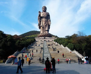 矗立在小靈山南麓的靈山大佛,包括蓮花座在內通高為八十八米,相當于一幢三十馀層樓房的高度,比“山是一尊佛,佛是一座山”的四川樂山大佛還要高出十七米,是迄今為止我國最高的巨型佛像。如果加上三層座基,總