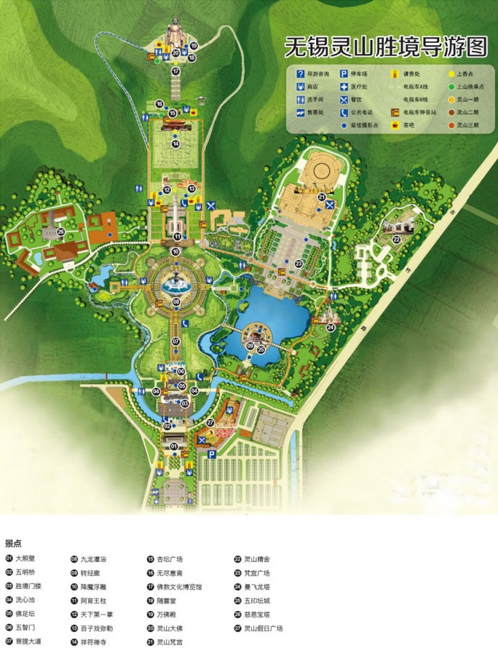 靈山大佛景區(qū)位于無錫太湖國家旅游度假區(qū),占地面積約30公頃。從靈湖大型果園停車場步行至照壁廣場,可見三山環(huán)抱,靈山大佛巍然屹立,氣勢雄偉壯觀。大佛南面太湖,背倚靈山,左挽青龍(山),右牽白虎(山),地靈形勝,風水佳絕,為難得之佛國寶地。靈山大照壁可謂