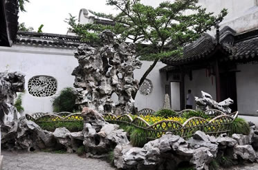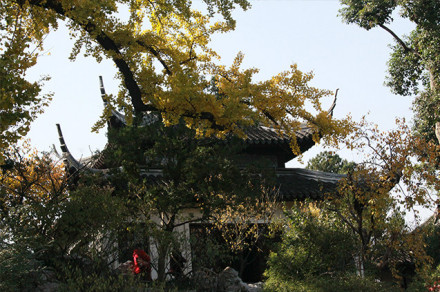 蘇州園林的植物配置基調(diào)是以落葉樹為主,常綠樹為輔。用竹類、芭蕉、藤蘿和草花作點(diǎn)綴,通過孤植和叢植的手法,選擇枝葉扶疏、體態(tài)瀟灑、色香清雅的花木,按照作畫的構(gòu)圖原理進(jìn)行栽植,使樹木不僅成為造景的素材,又是觀景的主題。許多樹木的種植與園林建筑和詩詞匾聯(lián)、人物典故相呼應(yīng),喻情于草木。獅子林的植物配置亦照此理,東部假山區(qū)以古柏和白皮松為主,西部和南部山地則以梅、竹、銀杏為主。配植色香態(tài)俱佳的花木,疏密相間,錯(cuò)落有致,不僅增加了林木森郁的氣氛。更使山石、建筑、樹木溶合一體,而成為真正的“城市山林”。指柏軒前假山上有元代古柏?cái)?shù)株,有白皮松五棵,姿態(tài)蒼勁,皆成畫意。暗香疏影樓和問梅閣推窗可見三、五株梅,疏影橫斜,暗香浮動。尤其問梅閣中桌椅、吊頂都是梅花形,窗紋用冰梅紋,書畫內(nèi)容亦與梅有關(guān),與地上“冰壺”古井共同構(gòu)成一幅思鄉(xiāng)的畫卷。更有文天樣《梅花詩》:“靜虛群動息,身雅一身清;春色憑誰記,梅花插座瓶”,借梅詠懷,體現(xiàn)了文天祥正氣凜然的高尚情操。山石間有六百年年銀杏一株,粗干老木,盤根錯(cuò)節(jié)于石隙間,夏日濃蔭庇日。秋葉燦若織錦,成為獅子林中一美景。