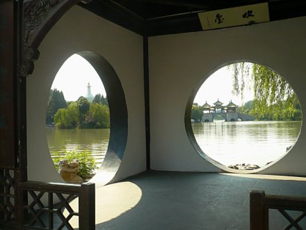 揚(yáng)州是中國(guó)的月亮城,揚(yáng)州賞月的地方很多,月觀就是其中之一。月觀坐西朝東,前臨開(kāi)闊的湖面,每當(dāng)皓月東升,憑欄而立,天上水中的兩個(gè)月亮交相輝映。月觀中的海梅家具也很有特點(diǎn),雕刻的內(nèi)容都和賞月有關(guān)。蓮花、鴛鴦、荷葉,藕節(jié)是揚(yáng)州木雕工藝的代表作品。