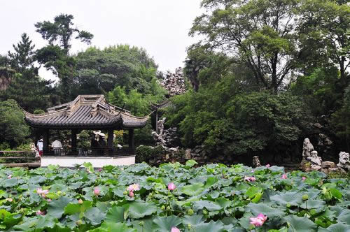 春秋閣東南下,有面闊五間、平挑入水、半架河上、前設半亭的水榭。延伸處有貼水平臺,三面圍以欄桿,中開方洞,露出水面一方,名“問魚淵”。時見小魚悠游,伸手可掬。水榭中間,由費新我書“層波疊影”額。水榭連廊,穿過春秋閣直通數(shù)魚檻,其中一段架于水面,故名“水旱廊”。數(shù)魚檻緊倚千步長廊,面闊七間,臨水而筑,池對面建有半亭,是從西水仙廟遷來。密密斗拱托撐飛檐之頂,古色古香。穿亭向前,有延伸入池的半島,上建六角攢尖的“綠漪亭”。 假山群在蠡園入口和“層波疊影”之間。一大片湖石堆疊而成的奇峰,嶙峋多姿,氣勢不凡。一條石徑,盤旋曲折,忽高忽低,忽寬忽狹,忽明忽暗。置身其間,聞聲不見人,可望不可即,如入迷宮。假山都以“云”字為題,有“云窩、云腳、穿云、朵云、