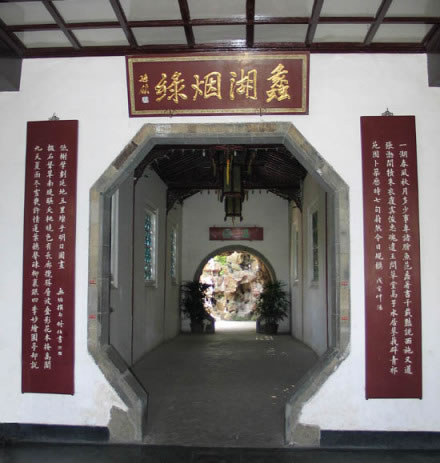 迎面八角形門洞上方,為“蠡湖煙綠”匾,由原江蘇省政協(xié)主席孫領先生手書。兩側為128字的“門”字長聯(lián),無垢撰句,陸修伯書。聯(lián)云:一湖春風秋月,多少事,專諸膾魚,范蠡著書,千載艷說西施,又道張渤開犢,朱衣復虞俊忠魂,遺王問草堂,高子水居,蓼莪辟青祁苑囿,卜筑歷時七旬,蔚然今朝規(guī)模;