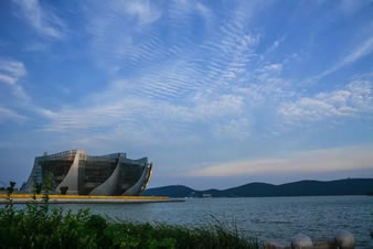 徐州水上世界,是設(shè)在湖中心的一座大型水族館,4A景區(qū)。它座落在云龍湖的湖心島上,其外形如長鯨擊水,又似白豚臥波,這個形象被制作成"錦繡中華"紫砂浮雕,鑲嵌在北京人民大會堂中央廳的墻壁上。