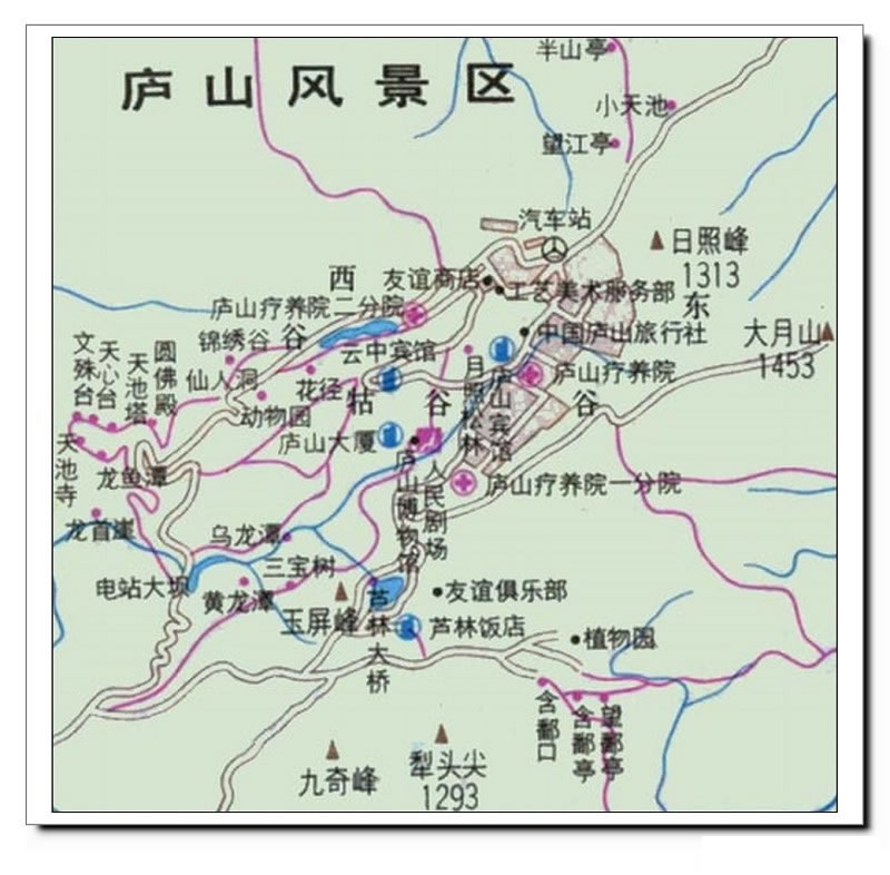 1 :北山公路-北山園門-小天池-望江亭-花徑-如琴湖-天橋-錦繡谷-仙人洞-大天池-蘆林湖-會址-東谷名人別墅-美廬-周恩來紀念室-牯嶺街