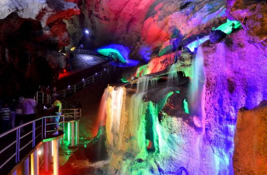 洞內(nèi)常年恒溫18度冬暖夏涼。洞內(nèi)景點多達一百余個,如:天堂大廳、童子拜觀音、千丘梯田、倒柳垂楊、許愿池、回龍廳等。最為壯觀的是洞內(nèi)的洞天飛瀑,它高九米寬七米,天然瀑布水從九米高的上空直奔洞池,濺起無數(shù)水花,聲勢浩大聲撼震天,為此洞一絕。清風(fēng)、怪石、流泉、飛瀑被稱為“洞中四絕”。