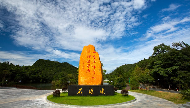 護(hù)源石是2017年紀(jì)念香港回歸20周年時所立,石碑上“一定要保護(hù)好東江源頭水”為周恩來總理的親筆題詞。1963年,香港遭遇了60多年來最嚴(yán)重的一次干旱,350萬人的生活因缺水陷入困境。當(dāng)年12月,周恩來總理親自批示,撥?钣昧11個月的時間在深圳建成了東深供水工程,把東江的水引到香港,從此結(jié)束了香港長期缺水的歷史。護(hù)源石形狀像一只手掌,寓意用手護(hù)源,石頭高5.23米,與東江流域長度523公里相對應(yīng),寬3米,代表贛、粵、港三地;護(hù)源石底座長4.65米,與三百山到香港的距離465公里相對應(yīng);花壇采用圓形,寓意“圓圓滿滿”。
