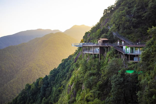 玻璃天橋,全長330米,寬2.5米,最高落差198米,是目前江西最長的玻璃天橋。山間云霧繚繞,橫跨兩山的玻璃橋仿佛橫架云端,恰似人間仙境。