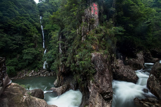 東江第一瀑由福鰲塘和山上大小溪流匯集而成,瀑布單級落差120多米,是目前景區(qū)發(fā)現(xiàn)單級落差最大的常流瀑布,氣勢雄偉,兩側(cè)峭壁凌空,古木參天。飛瀑前方視野開闊,遠(yuǎn)處青山疊翠,林海蒼茫,令人心曠神怡。石壁上東江源三個字是由全國政協(xié)原副主席葉選平題寫。