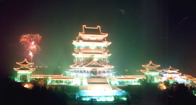 由一級(jí)高臺(tái)拾級(jí)而上,即達(dá)二級(jí)高臺(tái)(象征城墻的臺(tái)座)。這兩級(jí)高臺(tái)共有89級(jí)臺(tái)階,而新閣恰于1989年落成開(kāi)放。二級(jí)高臺(tái)的墻體及地坪,均為江西峽江縣所產(chǎn)花崗石。高臺(tái)的四周,為按宋代式樣打鑿而成的花崗石欄桿,古樸厚重,與瑰麗的主閣形成鮮明的對(duì)比。