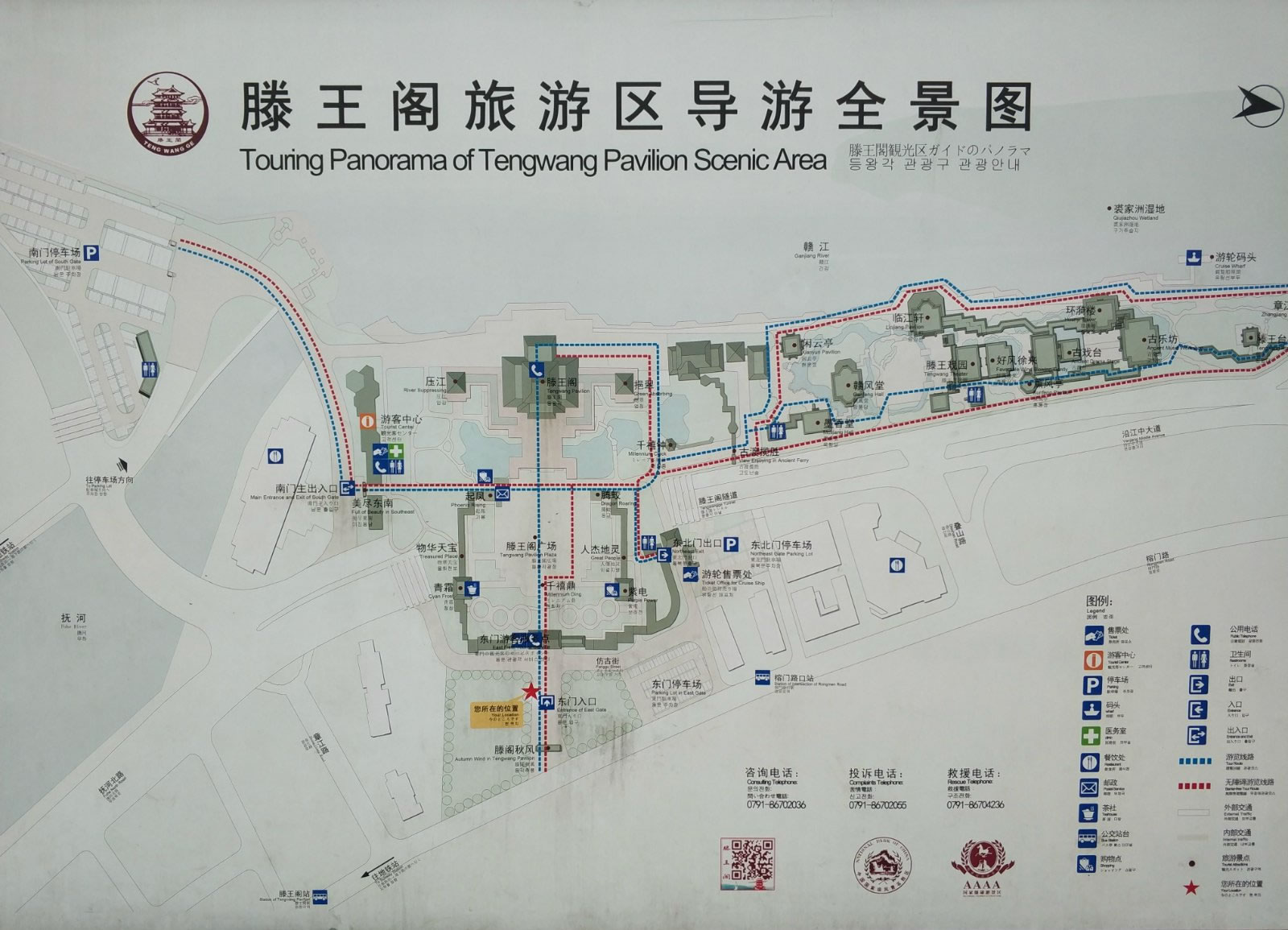 滕王閣座落于贛江與撫河故道的匯合處,占地4.3公頃,滕王閣在歷史上的興廢更迭達(dá)29次之多,現(xiàn)在的滕王閣主閣落成于1989年10月8日,共九層,凈高57.5米,南北配有回廊連接的兩個(gè)輔亭,建筑面積13000多平方米。瀕鄰南浦,面對(duì)西山,視野開(kāi)闊,距唐代閣址僅百余米,主體建筑為宋式仿木結(jié)構(gòu),碧瓦丹柱,雕梁飛檐,氣勢(shì)頗為雄偉。