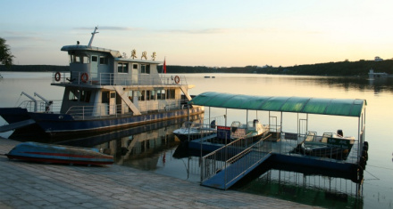 凈月潭水上游覽船舶集水上交通運(yùn)輸、游覽于一體。從任何一處碼頭上船都可以通向風(fēng)景區(qū)的幾個主要景點:大壩碼頭、沙灘浴場碼頭、橡樹灣碼頭(森林浴場)、滑雪場。凈月潭現(xiàn)有兩艘主要船舶。其中“乘風(fēng)號”游船系雙層雙體燃?xì)猸h(huán)保型游覽船舶,定員 100位。游客可在乘坐游船的同時觀賞凈月潭水的秀色。而“麒龍?zhí)枴笔且凰椰F(xiàn)代船舶,客艙內(nèi)配有電視、音樂,為游客播放凈月潭相關(guān)視頻,二層甲板處更是觀光遠(yuǎn)眺凈月風(fēng)景的好地方。凈月潭又從日本購進(jìn)多輛三座位的“水上摩托艇”,速度快、較刺激,可供游客自行駕駛。由“摩托艇”牽引,游人還可踩滑水板滑翔于潭面。由“快艇”牽引,乘坐五座位的火箭沖浪艇,也極具刺激性。
