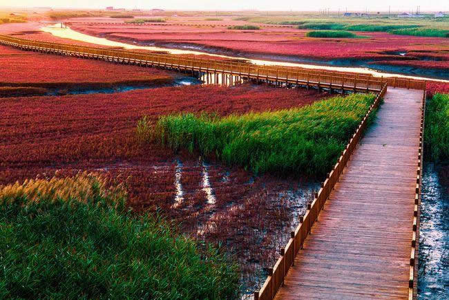 紅海灘國家風(fēng)景廊道它位于遼寧省盤錦紅海灘濕地旅游度假區(qū),南起二界溝混江溝大橋,北至紅海灘濕地旅游度假區(qū)接官廳大橋與旅游路接口,全長18.115公里。是獨一無二的“世界紅色海岸線”,也被稱為“中國最精彩的休閑廊道”和“中國最浪漫的游憩海岸線”。中國婚協(xié)授予了紅海灘國家風(fēng)景廊道“中國婚禮文化產(chǎn)業(yè)基地”榮譽。
