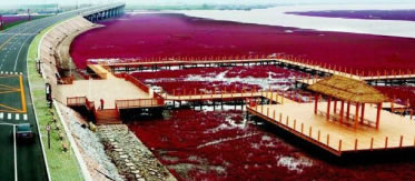 這里是遼河口和渤海的交界處,兩河水不斷地沖刷翅堿蓬,翅堿蓬會越來越紅。初一、十五大潮時海水蓋過翅堿蓬,成為一片大海的奇觀,潮落后,鮮艷的翅堿蓬依然矗立在泥潭中。