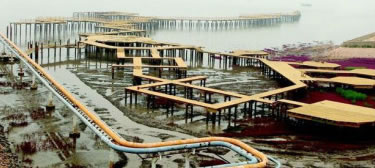 棧橋曲折綿長與海相接、與天相連,像一艘大船正要揚帆起航。游客漫步于上觀賞兩側(cè)的紅灘綠葦、聆聽候鳥的百囀千聲、感受大海的波瀾壯闊,仿佛乘舟依水而行,每每流連忘返。身臨其境的讓人感受到“落霞與孤鶩齊飛,秋水共長天一色”的唯美意境。