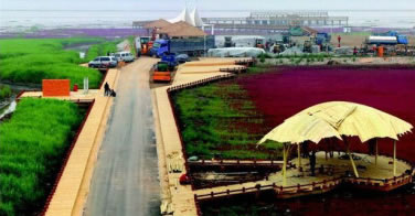 紅海灘四月初為嫩紅,漸次轉(zhuǎn)深,十月由紅變紫,最佳觀賞時間為五月至十月。這里魚肥蟹美,稻米飄香,海鷗與抽油機為伴,紅海灘與丹頂鶴相映,現(xiàn)代文明與原生文明共生。它以舉世罕見的紅海灘為特色,以全球保存最完好、規(guī)模最大的濕地資源為依托,以世界最大的蘆葦蕩為背景,與數(shù)以萬計的珍稀水禽和一望無際的淺海灘涂構(gòu)成了一條生態(tài)風(fēng)景廊道。它左側(cè)是旖旎延綿的紅海灘,右側(cè)是一望無際的蘆葦蕩。在春夏時節(jié),它們紅綠相濟;在秋冬時節(jié),它們金紅相映,一路貫通。
