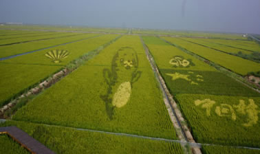 稻田作畫,又稱稻田彩繪,主要是以黃色、綠色和紫色葉水稻種植于水田中,栽種時先在農(nóng)田里用傳統(tǒng)畫線器,畫出九宮格,依圖樣定出坐標,再牽線繪出圖樣或字體輪廓,最后種上黃色秧苗,隨著水稻生長,就會呈現(xiàn)出預(yù)先規(guī)劃的圖形或文字。在不同的位置栽種不同的稻米品種,通過精細巧妙的排列組合,不同顏色葉子的稻米會在生長過程中自然鋪陳出一幅幅美麗的圖畫。稻田彩繪可以維持兩個半月左右。