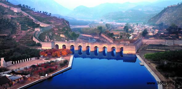 九門口長城:坐落在遼寧省綏中縣李家鄉(xiāng)新臺子村境內(nèi),距山海關(guān)15公里,全長1704米。其南端起于危峰絕壁間,與自山海關(guān)方向而來的長城相接。自此,長城沿山脊向北一直延伸到當(dāng)?shù)氐木沤幽习叮趯掃_(dá)百米的九江河上,筑起規(guī)模巨大的過河城橋,以此繼續(xù)向北逶迤于群山之間。“城在水上走,水在城中流。”便是人們對九門口長城的形象描述。