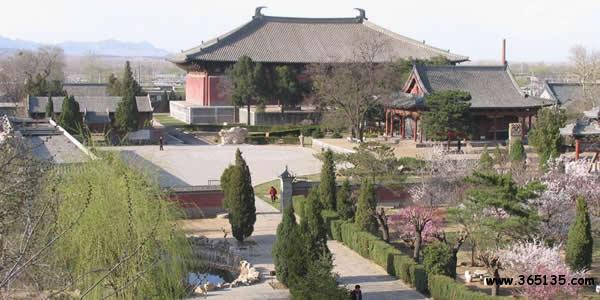 奉國(guó)寺:坐落在遼寧省義縣城內(nèi),始建于遼開(kāi)泰九年(公元1020年)因殿內(nèi)塑有七尊大佛,又俗稱大佛寺。奉國(guó)寺由山門、牌坊、無(wú)量殿、鐘亭、碑亭、大雄殿、西宮禪院等古建筑構(gòu)成,占地3萬(wàn)平方米,是一座宏偉壯觀,保存較為完整的古代寺院。大雄殿位于中軸線的北端,面寬9間,通長(zhǎng)55米,進(jìn)深5間,通寬33米,總高度24米,建筑面積1800多平方米。它不僅是國(guó)內(nèi)遼代遺存最大的木構(gòu)建筑,因其大雄殿規(guī)模面積全國(guó)最大,又堪稱中國(guó)寺院第一大雄寶殿。