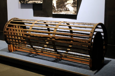 滾地籠刑具:這件黑色的鐵制滾地籠刑具,就是日偽時期被用于迫害抗日反滿志士及廣大無辜群眾的刑具。它縱66厘米,橫200厘米,呈圓柱形,中空,籠內(nèi)壁鑲滿鋒利的釘刺,釘尖向內(nèi),側(cè)面為鐵皮蓋,可打開。 該刑具原存于沈陽階級教育展覽館,后由遼寧近現(xiàn)代歷史博物館收藏,1998年,調(diào)撥給“九·一八”事變紀(jì)念館擴(kuò)建辦,1999年9月18日轉(zhuǎn)入“九·一八”歷史博物館收藏。