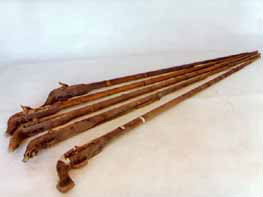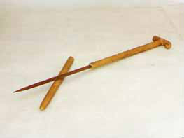 拐杖刀:俗稱“二人奪”,長約90厘米。表面上看呈拐杖型,木質(zhì)。但實際上,其前面是可以斷開的,拔出外鞘,里面是一個刺刀。這是抗日斗爭初期,東滿游擊隊和當(dāng)?shù)厝罕娪脕韺Ω稊橙说拿孛芪淦鳌J钱?dāng)時很流行很實用的武器。
