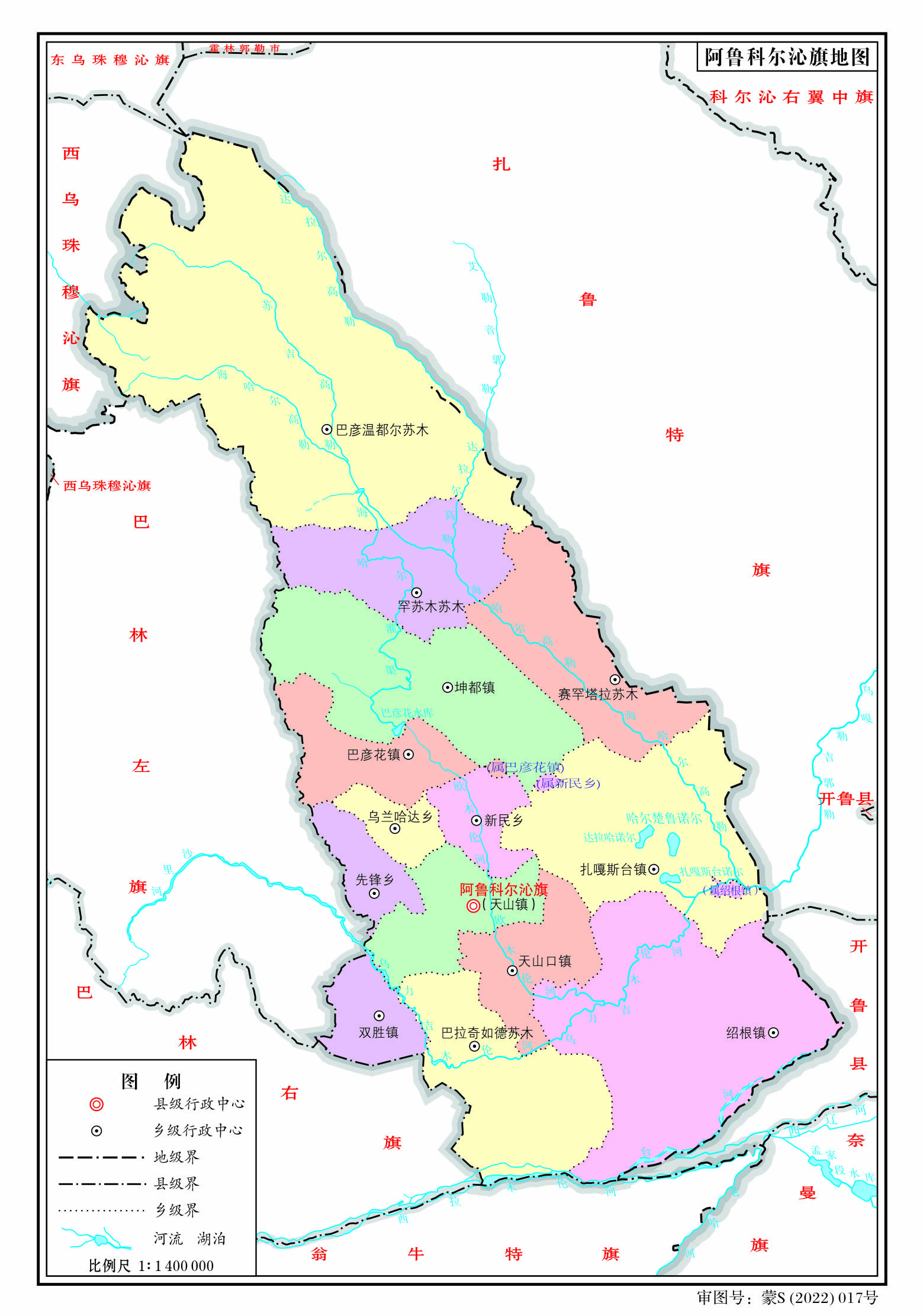 鎮(zhèn):天山鎮(zhèn)、天山口鎮(zhèn)、雙勝鎮(zhèn)、坤都鎮(zhèn)、巴彥花鎮(zhèn)、紹根鎮(zhèn)
