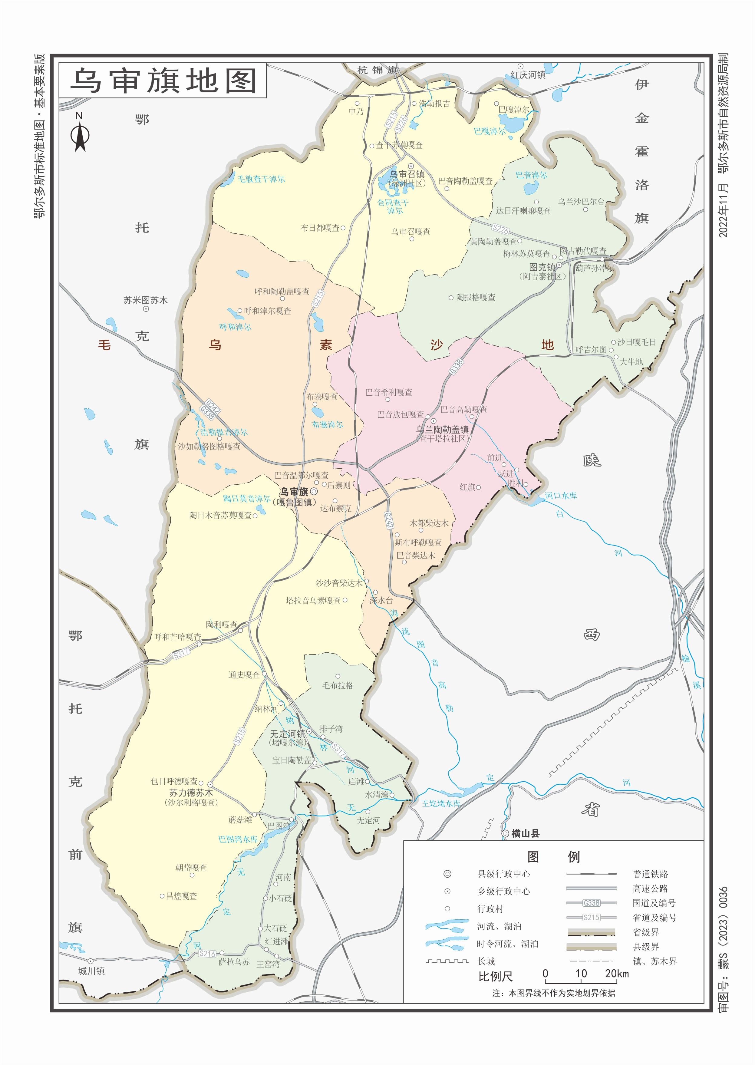 鎮(zhèn):達(dá)布察克鎮(zhèn)、烏審召鎮(zhèn)、圖克鎮(zhèn)、沙爾利格鎮(zhèn)、陶利鎮(zhèn)、烏蘭陶勒蓋鎮(zhèn)、納林河鎮(zhèn)